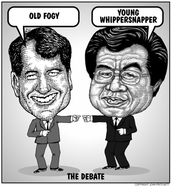 Honolulu Weekly 2-22-06 U.S. Senator Dan Akaka and challenger Ed Case debate the issues. Next Cartoon | Previous Cartoon | 2006 | Archives | Home | Search