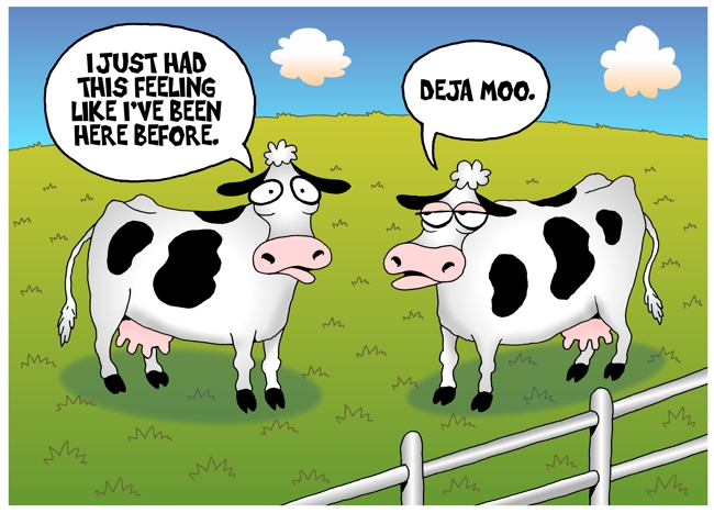 Cow has strange feeling she's been here before. For details on usage or to purchase original art Email Pritchett Crazy Cartoons | Site Map | Home Page