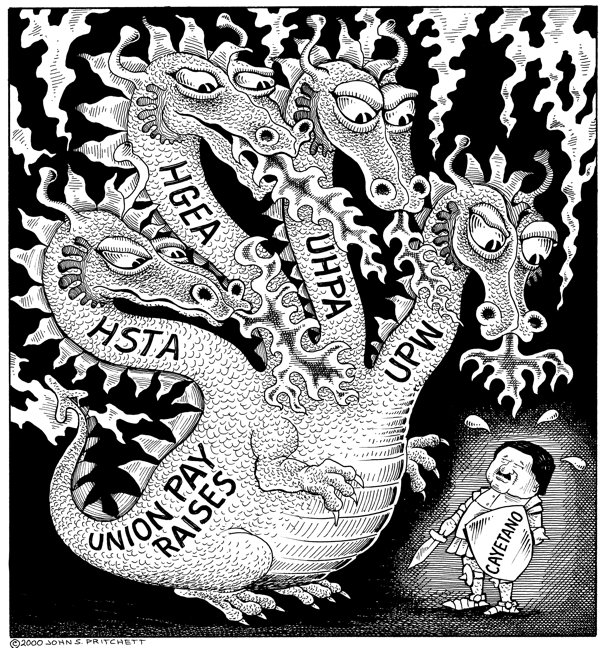 Honolulu Weekly 11-22-00 Governor Ben Cayetano faces four-headed dragon of union pay raises. | See it in Color Next Cartoon | Previous Cartoon | 2000 | Archives | Home | Search