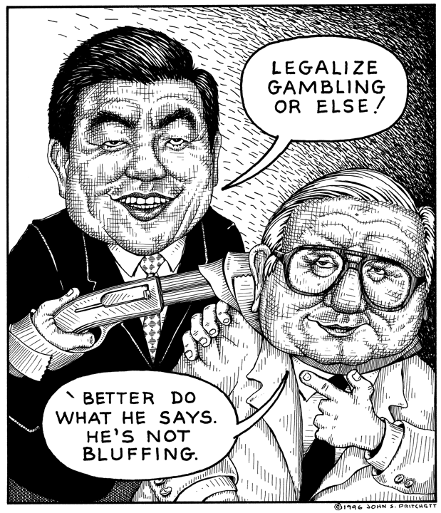 Honolulu Weekly 2-21-96 Hawaii legislators Mizuguchi and Souki mimic John Miranda hostage crisis. Next Cartoon | Previous Cartoon | 1996 | Archives | Home | Search