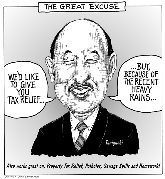 Honolulu Weekly 4-12-06 Senate Ways and Means Chairman Brian Taniguchi finds the perfect excuse. Next Cartoon | Previous Cartoon | 2006 | Archives | Home | Search