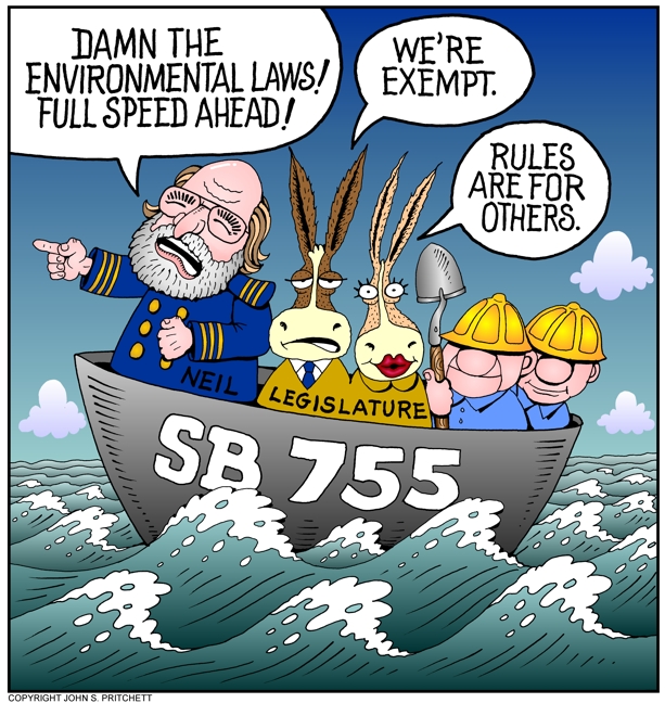 Senate Bill 755 seeks to exempt state from environmental laws. Next Cartoon | Previous Cartoon | 2012 | Archives | Home | Search