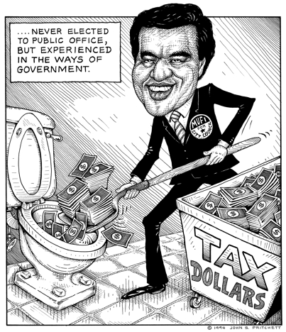 Honolulu Weekly 8-31-94 Never elected to public office but politically experienced, Mufi runs for city council. Next Cartoon | Previous Cartoon | 1994 | Archives | Home | Search