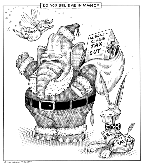 Honolulu Weekly 12-21-94 Political party fairies promise middle-class tax cuts, government spending cuts. Next Cartoon | Previous Cartoon | 1994 | Archives | Home | Search