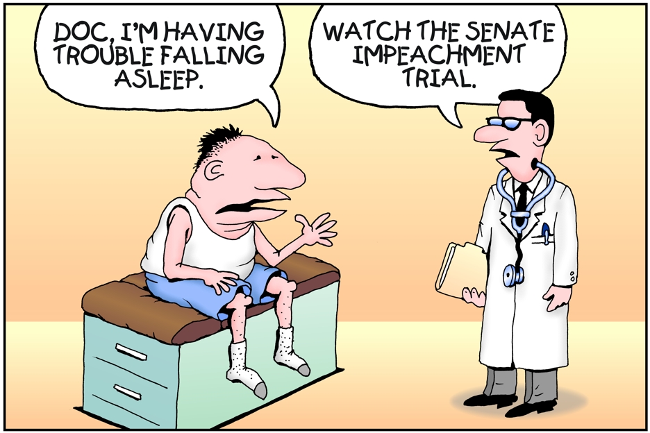 Senate impeachment trial cure for sleeplessness. Pritchett Cartoon for MidWeek January 29, 2020 | To comment, Email Pritchett Next Cartoon | Previous Cartoon | MidWeek Pritchett Cartoon Archive | Home Page