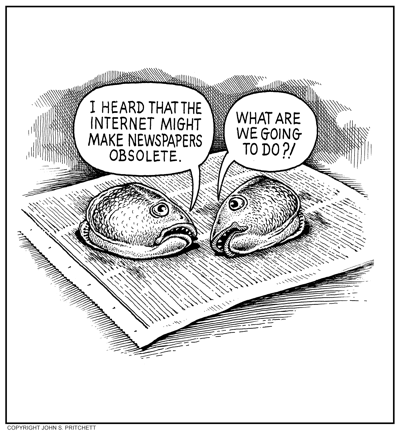 Honolulu Weekly 7-7-10 Fish heads discuss the impact of the Interenet on daily newspapers. Next Cartoon | Previous Cartoon | 2010 | Archives | Home | Search