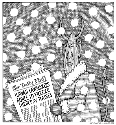 Honolulu Weekly 12-24-08 Hawaii legislature agrees to freeze their own pay raises - when hell freezes over. Next Cartoon | Previous Cartoon | 2008 | Archives | Home | Search