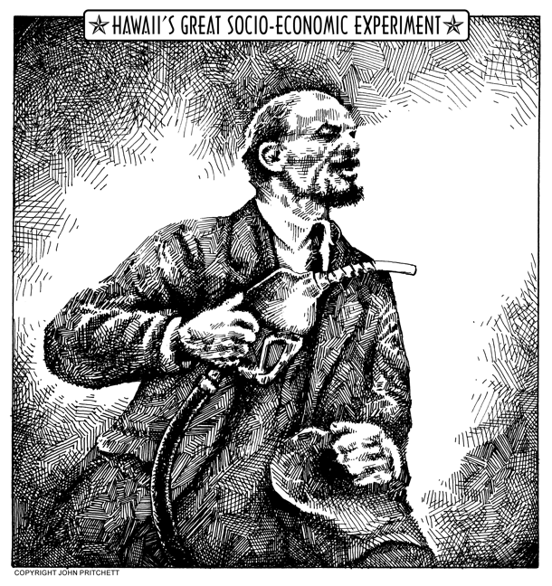 Honolulu Weekly 9-21-05 Hawaii's socio-economic experiment with a gas price cap. | See it in Color Next Cartoon | Previous Cartoon | 2005 | Archives | Home | Search