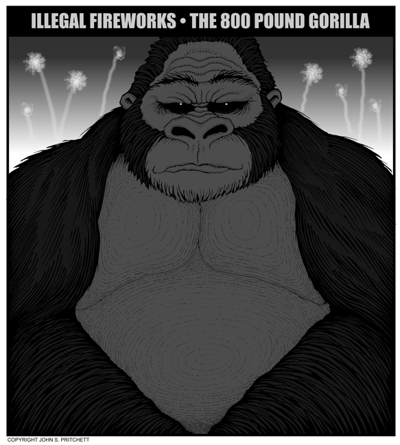 Honolulu Weekly 1-7-09 Hawaii's problem with illegal fireworks - the 800-pound gorilla. | See it in Color Next Cartoon | Previous Cartoon | 2009 | Archives | Home | Search