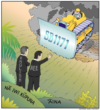 English and Hee Oppose SB1171 to Protect Iwi Kupuna, color version. Next Cartoon | Previous Cartoon | 2013 | Archives | Home | Search