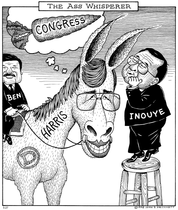 | Facing a likely challenge from Jeremy in the '98 Democratic primary, incumbent governor Ben Cayetano called on Senator Dan Inouye for help. Inouye summoned Jeremy to a private meeting. What was said at that meeting was never reported, but when it was over, it was clear that Jeremy would not be running for governor this time. Like "The Horse Whisperer," a popular movie of the day, Inouye was able to whisper just the right words to bring Jeremy into the Democrat donkey corral so that Ben could ride on to re-election. Honolulu Weekly cartoon 5-27-1998 |