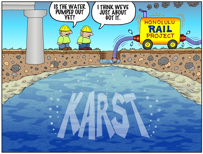 Honolulu Rail Project Encounters Karst. Pritchett Cartoon for MidWeek, April 29, 2015 | To comment, Email Pritchett Next Cartoon | Previous Cartoon | MidWeek Pritchett Cartoon Archive | Home Page | Search