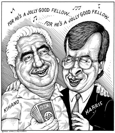 Honolulu Weekly 9-4-96 Mayor Harris and Danny Kihano are Jolly Good Fellows, corrupt politicians. Next Cartoon | Previous Cartoon | 1996 | Archives | Home | Search