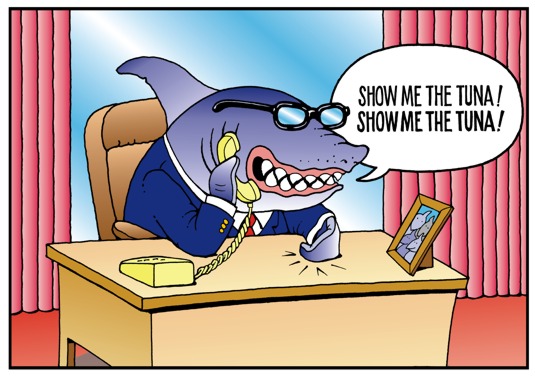 "Jerry Maguire Shark" For details on usage or to purchase original art Email Pritchett Crazy Cartoons | Site Map | Home Page