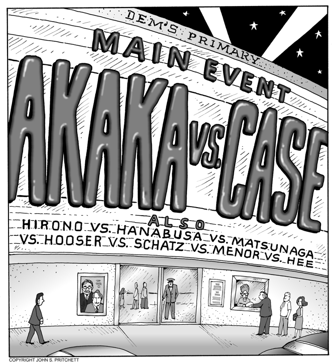 Honolulu Weekly 5-17-06 Akaka vs. Case, the main event of the 2006 Democrat primary. Next Cartoon | Previous Cartoon | 2006 | Archives | Home | Search