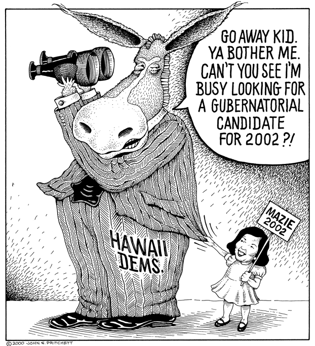 Honolulu Weekly 2-23-00 Hawaii Democrats ignore Mazie Hirono as candidate for governor in 2002 Next Cartoon | Previous Cartoon | 2000 | Archives | Home | Search