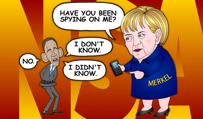 German Chancellor Angela Merkel scolds Obama for spying on her.