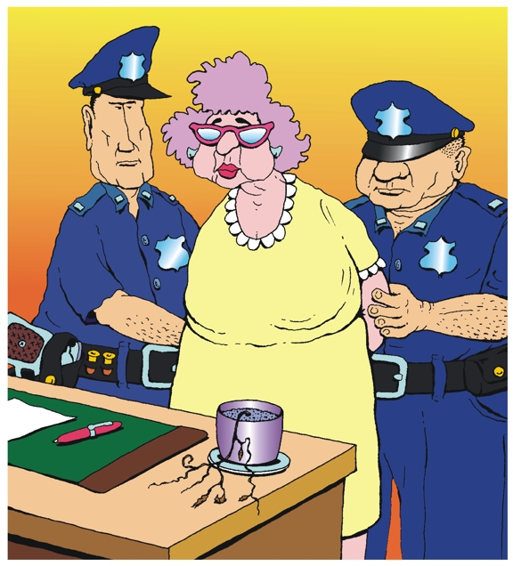Poor Mildred, arrested for killing her office plant. A failure to water. For details on usage or to purchase original art Email Pritchett Crazy Cartoons | Site Map | Home Page