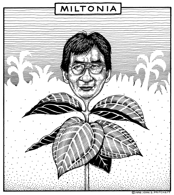 Honolulu Weekly 4-17-96 Like the invasive, annoying pest plant miconia, Milton Holt is, "Miltonia." Next Cartoon | Previous Cartoon | 1996 | Archives | Home | Search