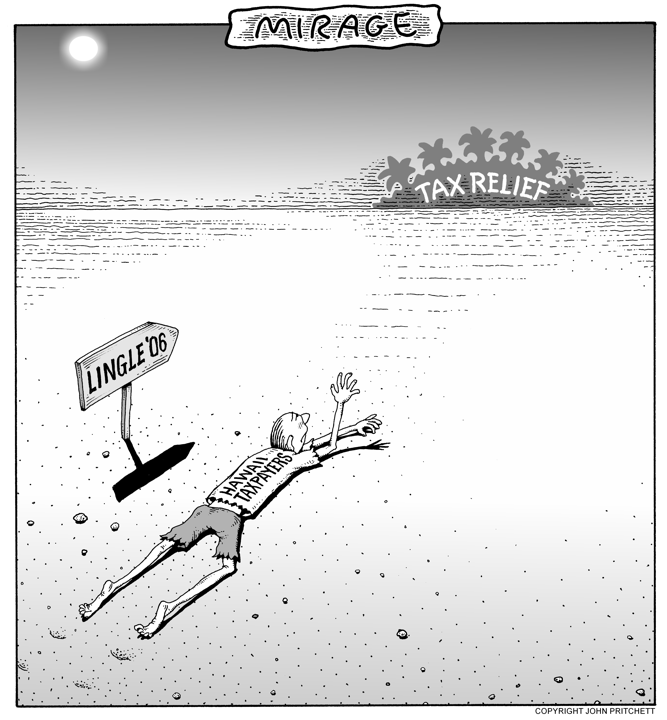 Honolulu Weekly 8-24-05 After raising taxes, Governor Lingle promises tax relief heading into the '06 election. Next Cartoon | Previous Cartoon | 2005 | Archives | Home | Search