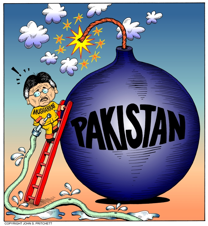 Pakistan president Musharraf tries to douse explosive situation For details on reprint usage, Email Pritchett Cartoon Archives | Site Map | Home Page | Search