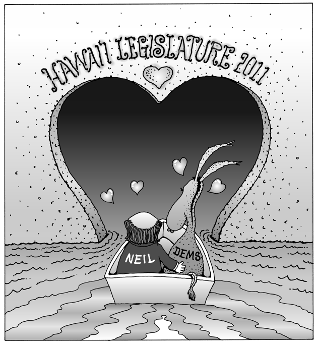 Honolulu Weekly 1-5-11 Neil Abercrombie and Democrats enter tunnel of love 2011 Legislature. | See it in Color Next Cartoon | Previous Cartoon | 2011 | Archives | Home | Search