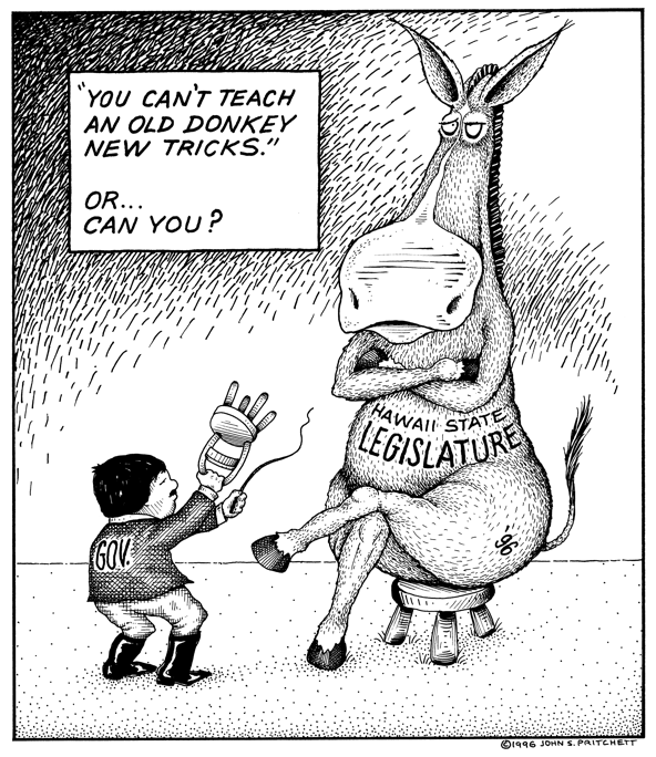 Honolulu Weekly 1-17-96 You can't teach an old donkey new tricks, or can you? Next Cartoon | Previous Cartoon | 1996 | Archives | Home | Search