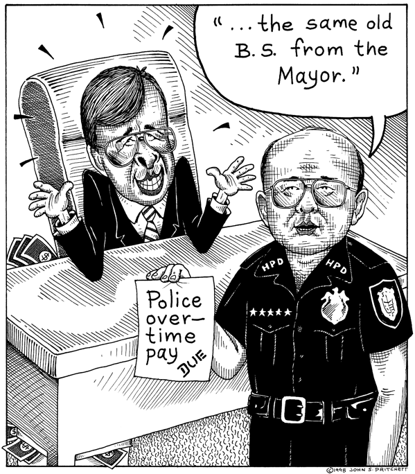 Honolulu Weekly 4-29-98 Honolulu Mayor Jeremy Harris refuses to pay for police overtime. Next Cartoon | Previous Cartoon | 1998 | Archives | Home | Search