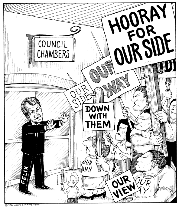 Honolulu Weekly 6-19-96 City Councilman John Henry Felix disallows signs in council chambers. Next Cartoon | Previous Cartoon | 1996 | Archives | Home | Search