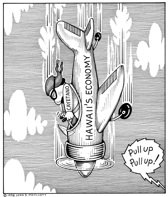Honolulu Weekly 3-4-98 Hawaii Governor Ben Cayetano tries to pull state out of economic nosedive. Next Cartoon | Previous Cartoon | 1998 | Archives | Home | Search