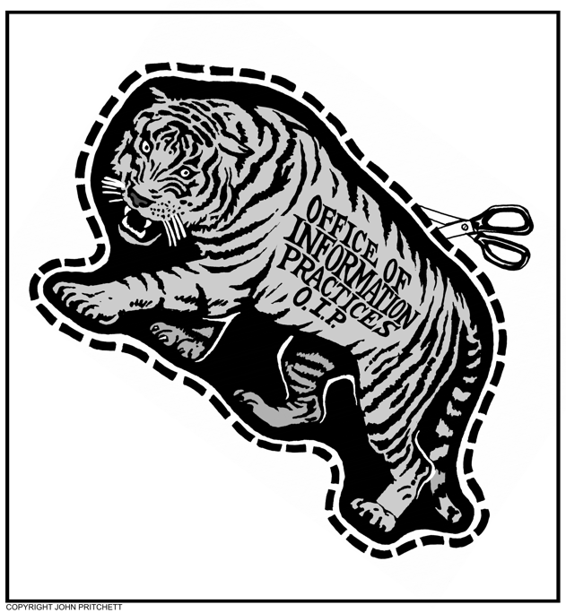Honolulu Weekly 11-2-05 Hawaii state Office of Information Practices is a paper tiger. Next Cartoon | Previous Cartoon | 2005 | Archives | Home | Search