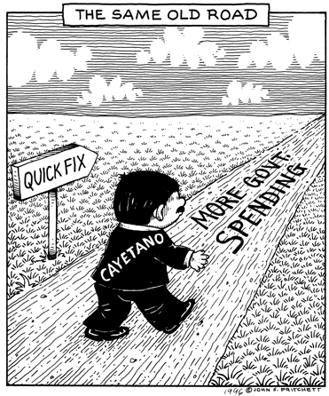 Honolulu Weekly 12-4-96 Governor Ben Cayetano takes the same old road of more spending to fix econmy. Next Cartoon | Previous Cartoon | 1996 | Archives | Home | Search