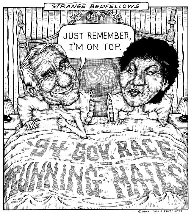 Honolulu Weekly 4-28-93 Frank Fasi offers to run in the governor's race with Pat Saiki as long as he's the one on top. Next Cartoon | Previous Cartoon | 1993 | Archives | Home | Search