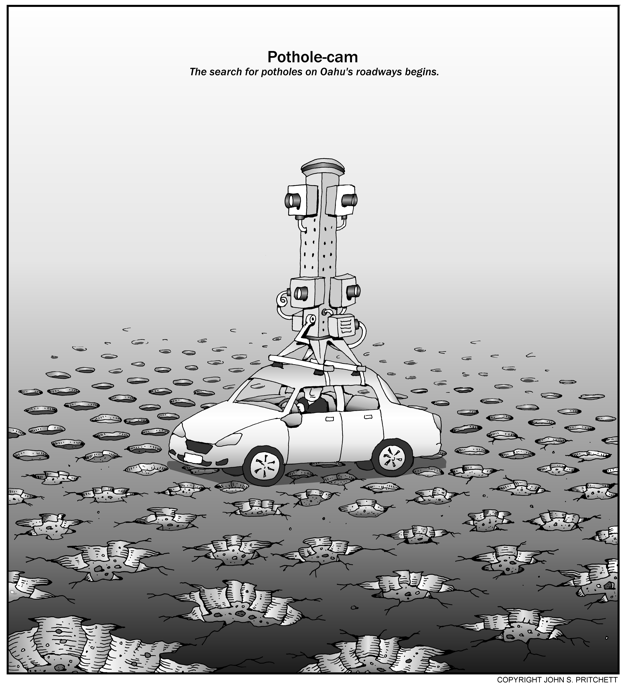 Honolulu Weekly 7-11-12 City and County of Honolulu buys expensive camera to find potholes. Next Cartoon | Previous Cartoon | 2012 | Archives | Home | Search