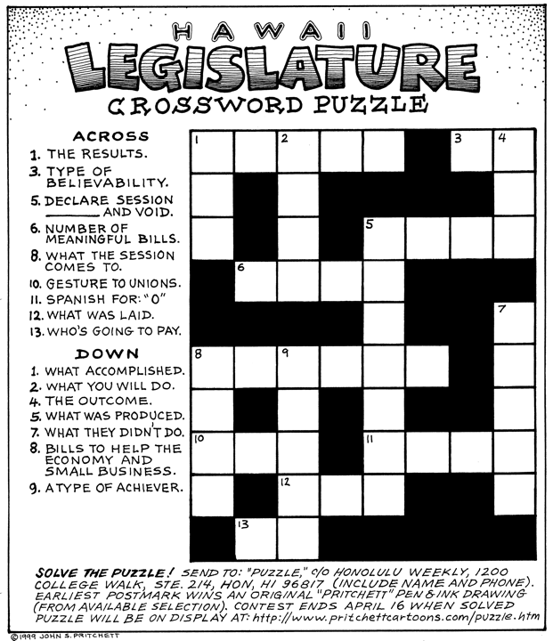 Honolulu Weekly 4-14-99 Hawaii Legislative Outcome Crossword Puzzle | Solved Puzzle Next Cartoon | Previous Cartoon | 1999 | Archives | Home | Search