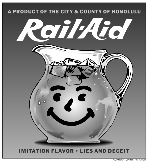Honolulu Weekly 8-24-11 City misleads, deceives public about Honolulu rail transit project. | See it in Color Next Cartoon | Previous Cartoon | 2011 | Archives | Home | Search