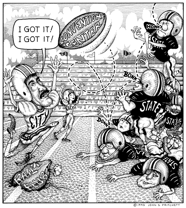Honolulu Weekly 5-12-93 Councilman Gary Gill calls for the Hawaii Convention Center ball, fumbled by the state legislature. Next Cartoon | Previous Cartoon | 1993 | Archives | Home | Search
