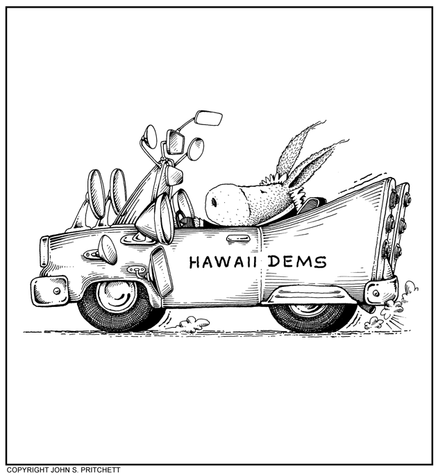 Honolulu Weekly 9-23-98 Hawaii Democrats Backwards Looking. | See it in Color Next Cartoon | Previous Cartoon | 1998 | Archives | Home | Search