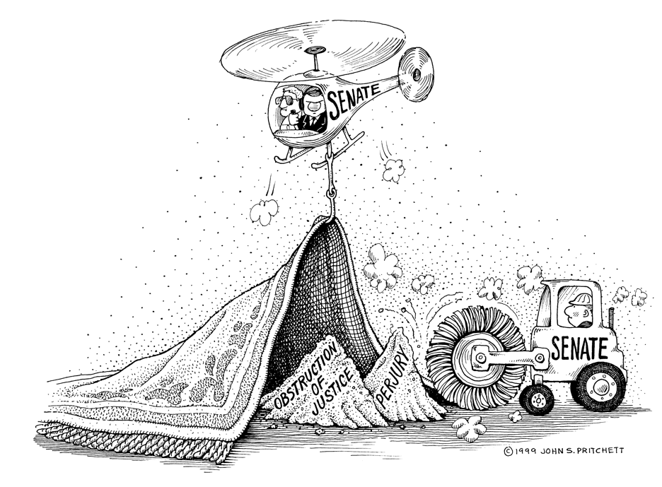 "Bill Clinton dirt swept under the rug." For details on usage or to purchase the original artwork: Email Pritchett Clinton Cartoons | Home Page | Site Map | Search