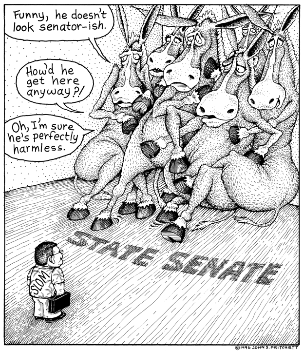 Honolulu Weekly 11-13-96 Republican Sam Slom wins state senate seat, majority Democrat donkeys cower in fear and shock. Next Cartoon | Previous Cartoon | 1996 | Archives | Home | Search