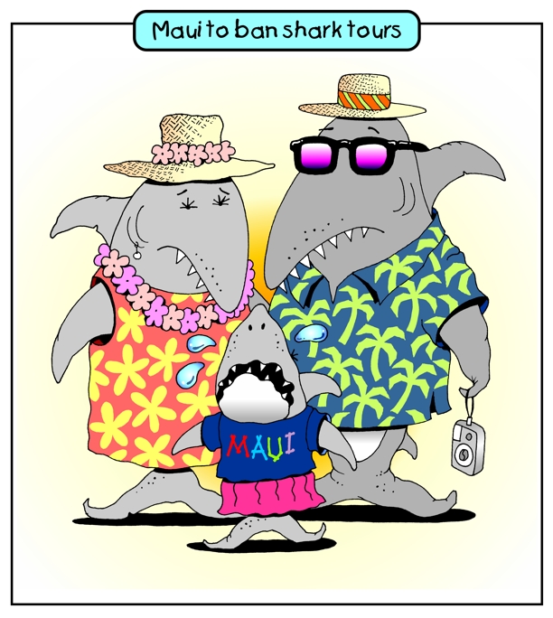 Shark family learns of ban on shark tours on Maui For details on usage or to purchase original art Email Pritchett Crazy Cartoons | Site Map | Home Page
