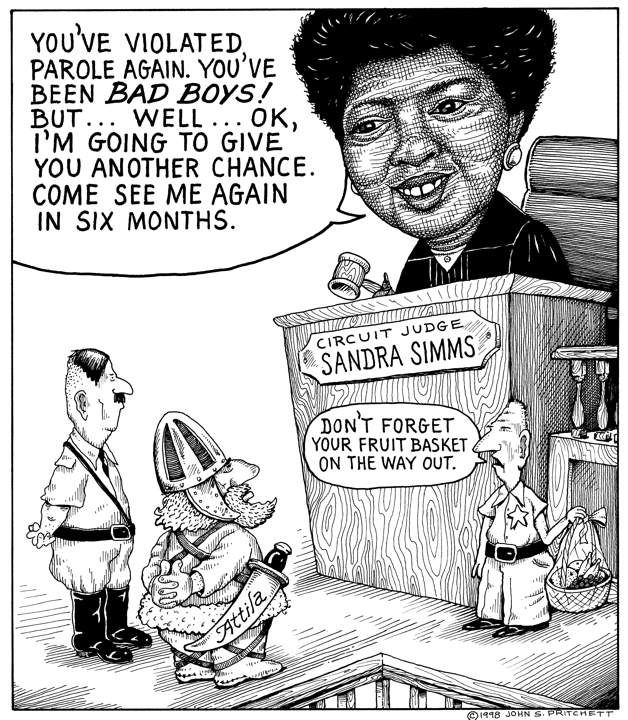 Honolulu Weekly 11-4-98 Hawaii Circuit Judge Sandra Simms is soft on criminals. Next Cartoon | Previous Cartoon | 1998 | Archives | Home | Search