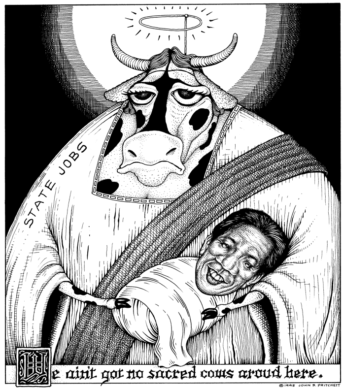 Honolulu Weekly 3-15-95 Hawaii representative Calvin say says state jobs not sacred cow. Next Cartoon | Previous Cartoon | 1995 | Archives | Home | Search