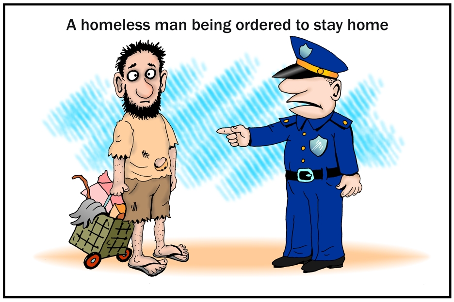 COVID-19 restrictions, Homeless man ordered to stay home. Pritchett Cartoon for MidWeek April 29, 2020 | To comment, Email Pritchett Next Cartoon | Previous Cartoon | MidWeek Pritchett Cartoon Archive | Home Page