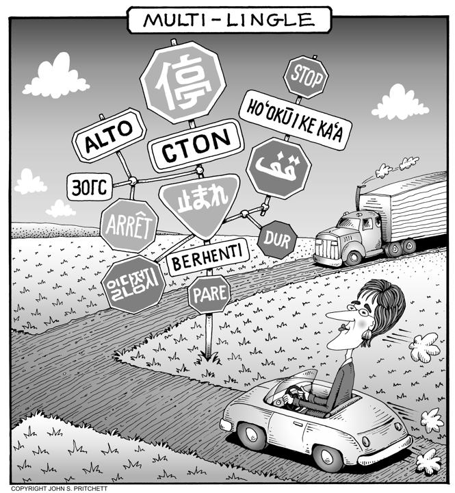 Honolulu Weekly 7-19-06 Multi-Lingle, multilingual road signs | See it in Color Next Cartoon | Previous Cartoon | 2006 | Archives | Home | Search