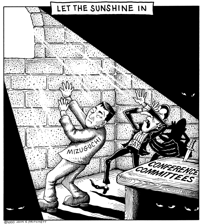 Honolulu Weekly 3-16-00 Hawaii Legislative Conference Committees meet in darkness, secrecy. Next Cartoon | Previous Cartoon | 2000 | Archives | Home | Search