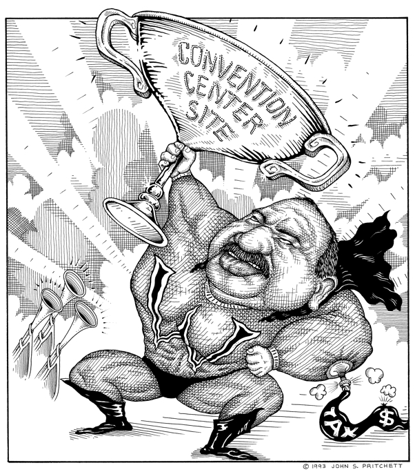 Honolulu Weekly 11-31-93 Hawaii Governor hearolds the final selection of the site for the Hawaii Convention Center. Next Cartoon | Previous Cartoon | 1993 | Archives | Home | Search