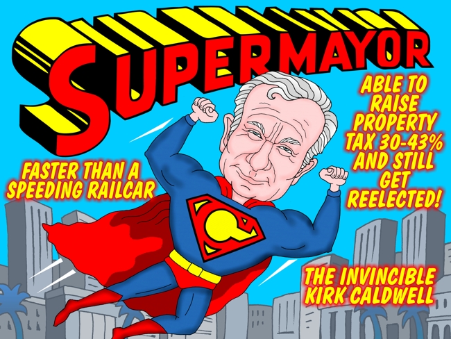 Honolulu Mayor Kirk Caldwell is Supermayor, Invincible. Pritchett Cartoon for MidWeek, July 8, 2015 | To comment, Email Pritchett Next Cartoon | Previous Cartoon | MidWeek Pritchett Cartoon Archive | Home Page | Search