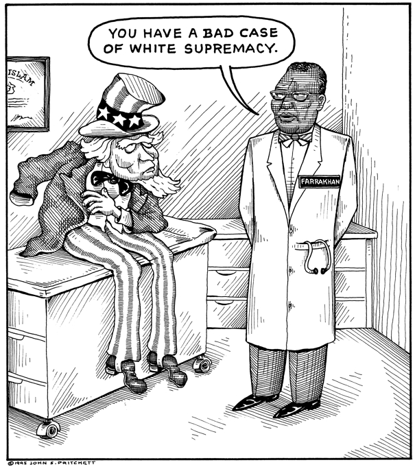 Honolulu Weekly 10-18-95 Louis Farrakhan makes the diagnoses. Next Cartoon | Previous Cartoon | 1995 | Archives | Home | Search