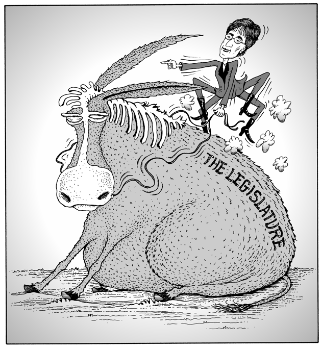 Honolulu Weekly 2-19-03 Tallyho! Hawaii Republican Governor Linda Lingle rides Democratic legislature donkey. Next Cartoon | Previous Cartoon | 2003 | Archives | Home | Search